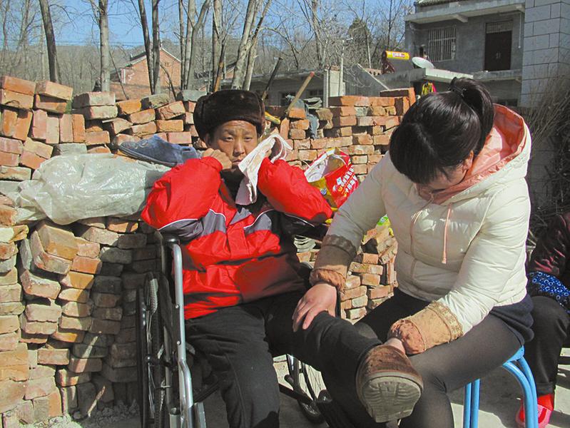 妻子在刘军平晒太阳的时候给他按摩腿部和脚,促进血液循环。 3月16日,阳光明媚。在商州区夜村镇青岗坪村,残疾人刘军平的妻子张和平帮婆婆做好了饭,给躺在床上的军平端了一碗稀饭,刘军平拿一根吸管慢慢地吸着稀饭。