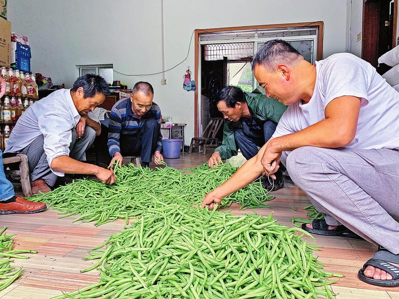 7月14日,洛南县景村镇杨坪村村民正在挑选豆角。据了解,该村与麻坪镇的德盛高山蔬菜合作社签订订单协议,以每公斤2元的价格保底收购豆角,全村45户村民种植豆角200多亩,仅此一项户均年收入3000多元。(记者 谢非摄)
