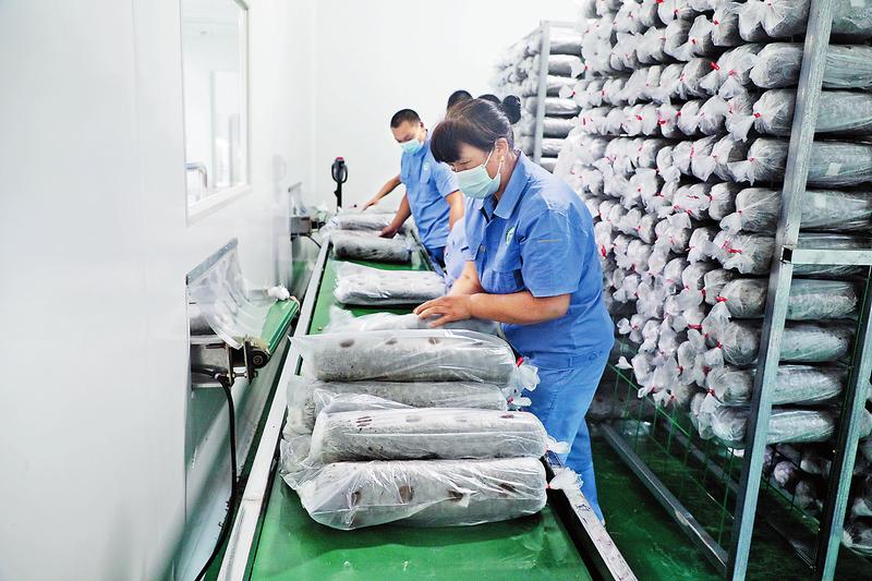 汤继春说:“在真姬菇现代化生产车间中,年可种植1800万瓶真姬菇,每瓶的价格在4.5元左右。同时,公司充分发挥龙头企业‘头雁效应’,年可生产1000万袋的香菇菌棒,以每袋4元左右的价格卖给菇农,使菇农免去打料、装袋、接种等复杂工序,为菇农节省了人力、物力。菇农种植出的香菇,公司再进行产品回收,带动全县农户大规模发展食用菌种植。依托交易中心将全县菇农的香菇进行收购,使农产品进行整合,以便打造特色品牌、畅通销售渠道。我们通过‘扶贫832’等销售平台把全县农产品卖向全国,推动全县食用菌产业持续健康发展,促进群众增收,带动群众致富。”