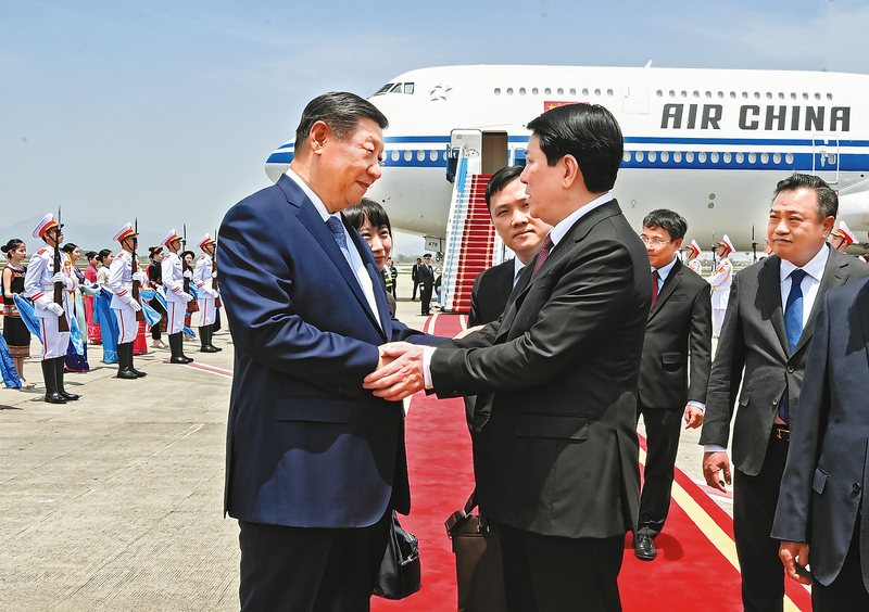 当地时间4月14日中午,中共中央总书记、国家主席习近平乘专机抵达河内,应越南共产党中央委员会总书记苏林、越南社会主义共和国主席梁强邀请,对越南进行国事访问。习近平乘专机抵达河内内排国际机场时,越南国家主席梁强,越共中央政治局委员、中央书记处常务书记陈锦绣,越共中央书记处书记、中央办公厅主任黎怀忠等越南党政领导人和地方代表热情迎接。 (新华社记者 李学仁 摄)新华社河内4月14日电 (记者 杨依军 邹学冕)当地时间4月14日中午,中共中央总书记、国家主席习近平乘专机抵达河内,应越南共产党中央委员会总书记苏林、越南社会主义共和国主席梁强邀请,对越南进行国事访问。
