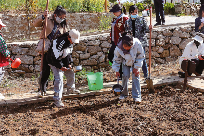 开垦出一块平整、干净的菜园是小记者们当天活动的首要任务。随着活动的开始,小记者将锄头啃进紧实的黄土地,翻起的土块碎裂成细壤,碎石和草根被筛到垄边。待开垦完毕,再将混在土壤里的顽固草茎、碎石瓦砾和干枯枝条逐一剔除,一块新翻的土地蓬松起伏,空气中混杂着泥土与草木的清香。