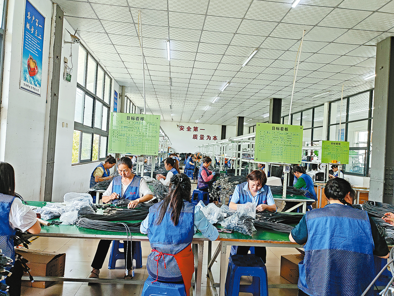 6月4日,丹凤县竹林关镇社区工厂万朋辉电子厂生产车间内,50余名工人正在有条不紊地加工数据线。据了解,该厂采用“厂内用工+外包加工”的形式,就地就近吸纳近300名劳动力就业,计划今年扩大生产规模,新增20条生产线,更好地促进当地群众就业增收。 (本报通讯员 王 蒙 摄)