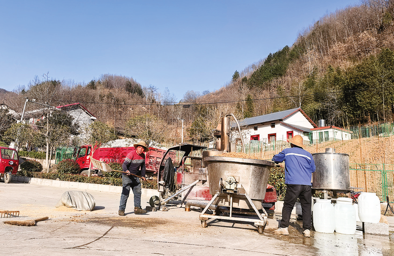 酿酒师傅忙碌工作,准备出酒。“春酿新醅邀日月,风携酒香漫山村”。仲春时节,镇安县高峰镇长坡村,青山含黛,清泉潺潺。4月7日,和煦的阳光洒进长坡村的一个农家小院,作坊里热气氤氲,粮香、曲香交织弥漫。这里没有春日的慵懒闲适,只有一派热火朝天的忙碌——粉碎玉米的声响、蒸煮粮食的沸腾声、师傅们扯着嗓子的交谈声,汇成一曲春日生产的奋进乐章。师傅们各司其职,从粉碎、拌曲到入缸、封窖,每一步都严谨细致,每一招都饱含匠心,将世代相传的秦岭古法酿酒技艺,在春光里演绎得淋漓尽致。
