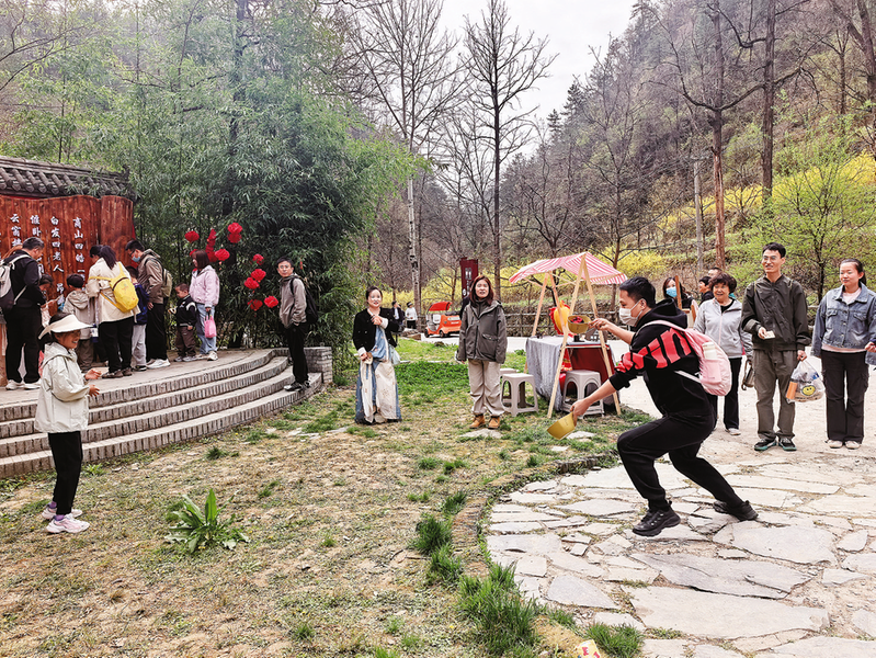 除了舌尖上的满足,景区内还设置了四皓辨药、投壶射箭、成语接龙等NPC互动游戏。游客参与游戏即可赢取“银票”,兑换特色礼品或直接抵现金消费,趣味性与文化性兼具。峡谷踏青、春茶品饮、非遗DIY……秦岭江山景区用一场“最野烟火气”的春日盛宴,留住了无数欢声笑语。