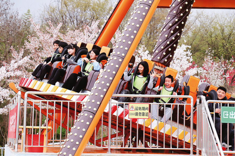 4月5日,音乐小镇秋沙鸭亲子乐园内,游客乘坐大摆锤体验游玩乐趣。 去亲子乐园撒欢、赴山野逐风越野、踏花海嬉游打卡……清明假期,洛南县在春日旅游热潮与假日经济的双重加持下,上演了一场秦岭生态禀赋与现代休闲需求交织的春日消费盛宴,小城处处烟火升腾、活力满满。