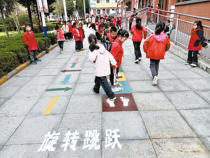 为丰富学生课余生活,激发学生课间运动热情,丹凤县峦庄镇中心小学结合实际,在校园活动场地规划出篮球场地、左右跳、旋转跳跃等十几种主题活动场地,深受学生喜爱。图为4月7日,该校学生在课间休息时间玩耍。