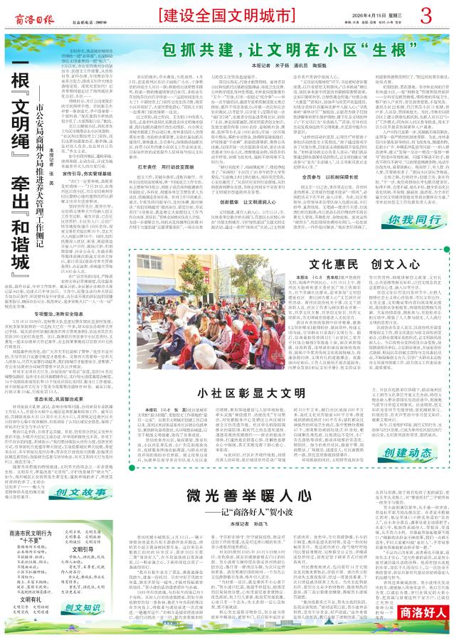 本报讯 (记者 党率航)歌声悠扬传文明,戏曲声声润民心。4月10日上午,商州区大赵峪街道王巷社区广场上热闹非凡,台下坐满社区群众,前来参加“文明创建进社区 惠民演出暖人心”文艺演出宣传活动。商州区政协机关干部、区文工团演职人员、社区工作者与辖区群众齐聚一堂,共享文化大餐、共学创文知识、共传文明新风,为文明城市创建注入文化活力。