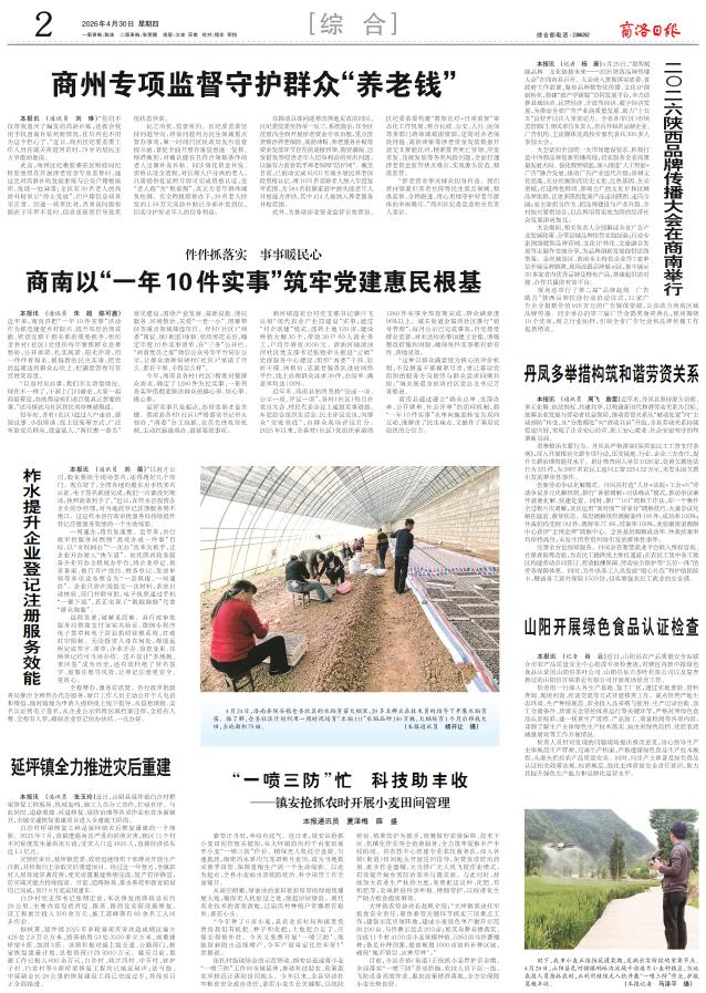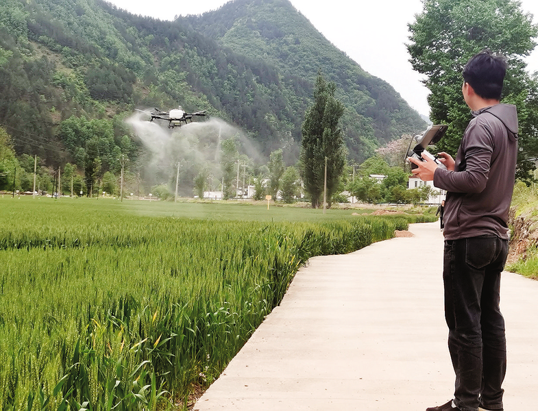 时下,我市小麦正值扬花灌浆期,是病虫害防控的重要节点。4月28日,山阳县色河铺镇峒峪沟流域千亩连片小麦种植区,当地农技人员抢抓农时,正利用植保无人机开展“一喷三防”作业,护航夏粮丰收。 (本报记者 马泽平 摄)