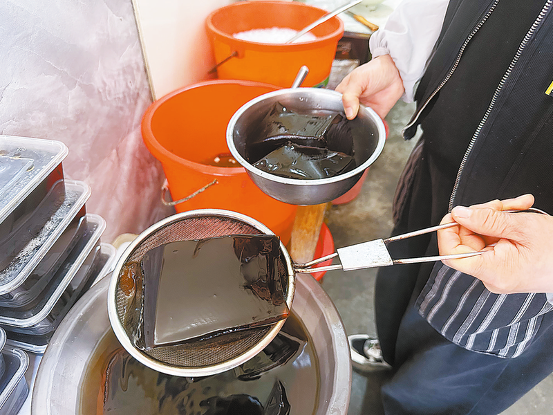 据介绍,曹淑娥老家的亲戚会根据店里的需求,给殷家夫妇带神仙叶。洗干净的神仙叶经过晾干,用开水烫过,再用手使劲揉搓,过滤出汁,这样反复烫、挤,最后将汁水形成的糊状物倒进盆子里,不用加任何东西,放凉,很快就变成凝胶状,这就是神仙叶凉粉。静置一个晚上,第二天就非常筋道了。加水漂去苦味,再切开,泡在水里,就是铺子里能见到的样子了。