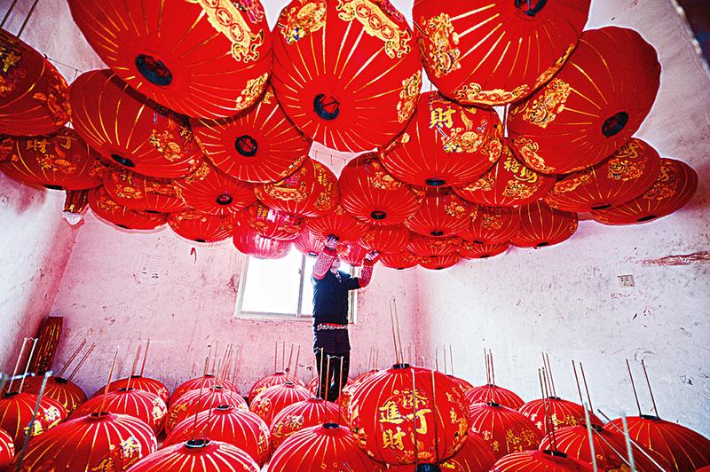 1月7日,义乌市官端前村一家灯笼生产企业的工人把做好的灯笼挂起来晾干。象征团圆喜庆的大红灯笼历来是新年年货市场的热销产品,也带动了义乌周边乡村的灯笼产业,多个灯笼专业村的工人们加班加点赶制灯笼,每天不断发往国内外市场。(新华社记者 徐 昱 摄)