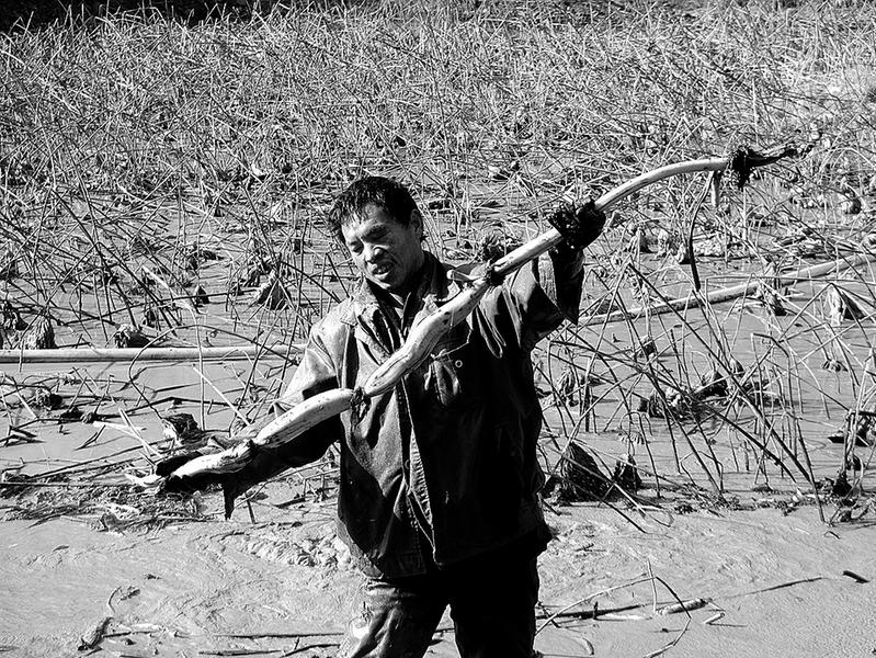 雪藕,莲藕的一种,因其“色白如雪”而得名,诗人韩愈曾有“冷比霜雪甘比蜜,一片入口沉疴痊”之赞。韩正彦是漫川关镇街道村人,2010年在朋友的推荐下以每斤18元的价格从兰州买了200斤雪莲种子,第二年便在水码头村租了一亩地尝试着种。见到韩正彦时,他穿着一身橡胶防水裤在齐腰深的冷水中挖藕。半蹲身子,他一手摸藕,一手持一支高压水枪,对准被淤泥裹住的莲藕冲水,再把“冲”出淤泥的藕顺势一捋,斜着一拔,一串鲜藕就浮出了水面。