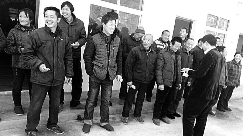 山阳县杨地镇按照“企业+基地+农户”的模式,通过企业扶持,让贫困户通过养殖脱贫致富。图为福林畜牧发展有限责任公司经理刘家林给49户贫困户兑付利润分红。 (李顺达 石福霞 摄)