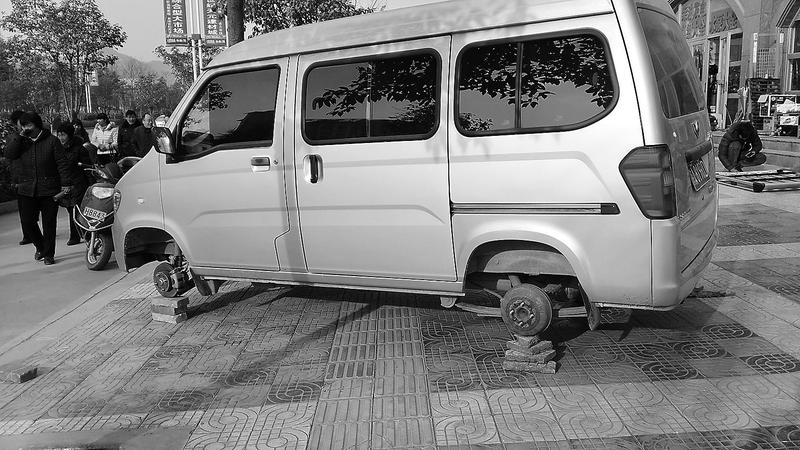 1月23日,在市区江滨大道与东环路十字交汇处,一辆面包车的四个车轮不翼而飞,取而代之的是几块砖头。据了解,这是一起车轮被盗案。记者在此提醒司机师傅,夜间不要随意长时间将车辆停放在路边。 (记者 张瑞 费翔 摄)