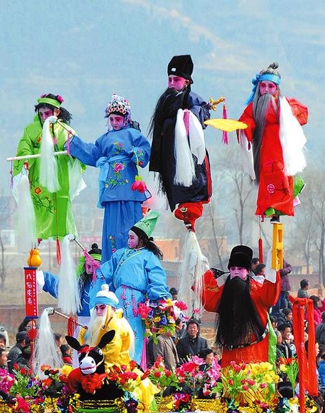 踩高跷也是社火的一种重要表演形式。高跷用高的椽子做成,踩高跷是个技术活,技术越高,踩的高跷就越高。表演前需要先练习,只有掌握了踩高跷的本领才能登台表演。高跷的内容很丰富,可以三人一组,也可以多人,根据所要表达的内容而定。传统内容有“梁山伯与祝英台”“三打白骨精”“白蛇传”等。社火也会紧扣时代主题,与时俱进。