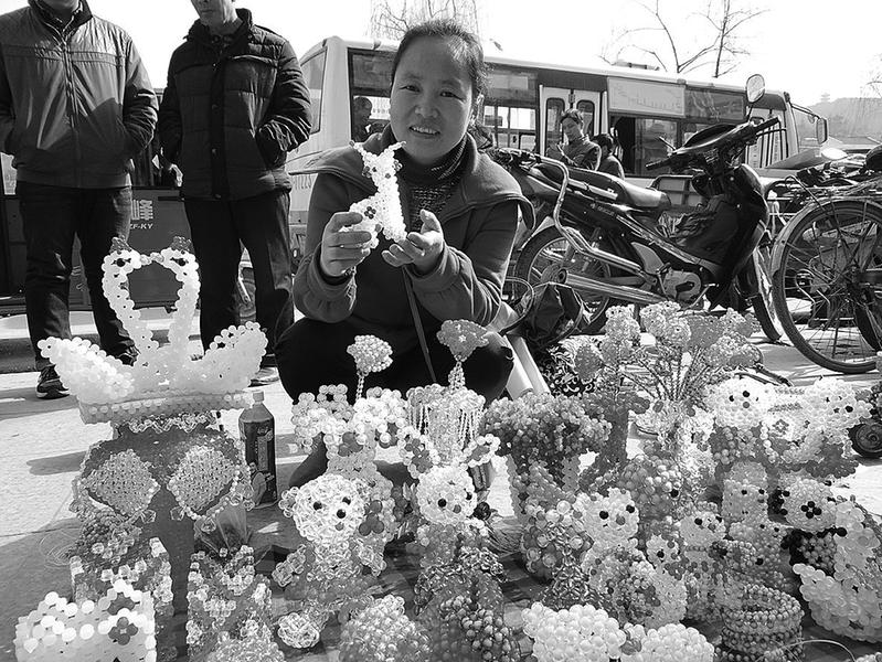 洁白的天鹅,五彩的花卉,3月3日,记者在洛南县街头看到,下岗女工孙莉、袁君用珠串制成的工艺品绚烂夺目,吸引了很多路过的群众前来询价购买。(记者 左京 吉文艳 摄)