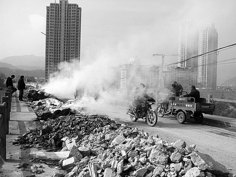 3月6日10时许,有人点燃了市区刘湾大桥东侧桥面上的垃圾,浓烟滚滚,空气中散发着淹刺鼻的气味。大桥东侧堆满了生活和建筑垃圾,严重污染了环境。刘湾丹江大桥作为危桥,其北侧做了封闭,尽管封闭墙上写着“危桥”告示,但图走近路的小车、行人和农用车、摩托车仍然穿行,存在安全隐患。(记者 赵有良 贾书章 摄)