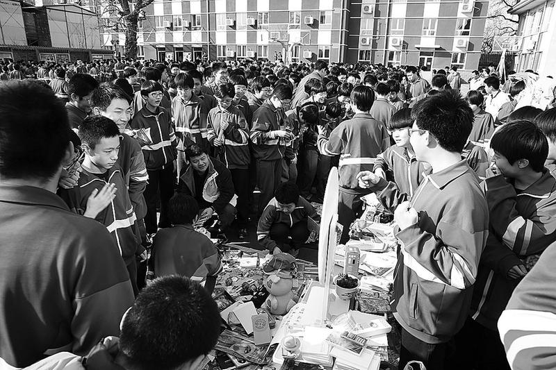 3月10日,北京市第五中学分校团委组织学生举办爱心义卖活动。学生们将生活中闲置不用的文具、书籍、玩具、工艺品及自己创作的书法绘画等物品,自愿捐赠出来进行义卖。活动义卖物品5000多件,筹得善款5万余元,全部善款将由学校团委以购买树苗的形式用于帮助顺义太阳村,并让学生通过义务植树培养公益和环保意识。 (新华社发 周 良 摄)