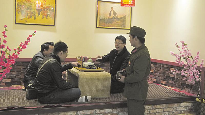 顾客在土炕上品茶 “报告,首长请指示!”“是,立即执行!”这一幕不是演电影,而是出现在城郊的一家火锅店。这家店的老板叫姜丹枫,是一位80后,凭着多年在外打拼的经验和出色的创意,在城郊任塬村开了一家红色主题火锅店,从芦苇墙、发报机、台式电话到服务员,清一色的红色经典装饰风格,让吃饭的人们不仅享受到了美食的乐趣,也让人们回忆起曾经的激情岁月。