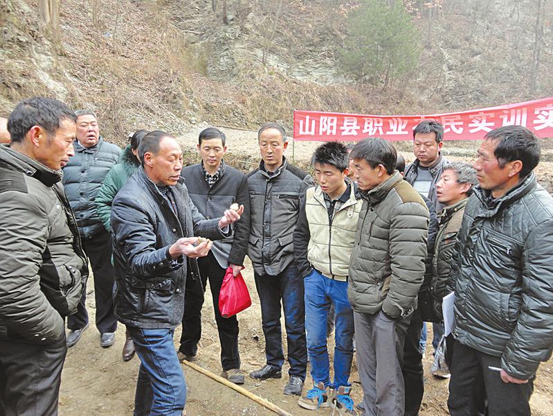 连日来,山阳县农民科技教育培训中心紧抓春季药业种植有利时机,组织职业农民开展茯苓、猪苓等中药材种植技术培训,增强药农依靠科技致富能力。图为实训教师在实训基地为中药材种植户现场示范猪苓种植关键技术操作过程。