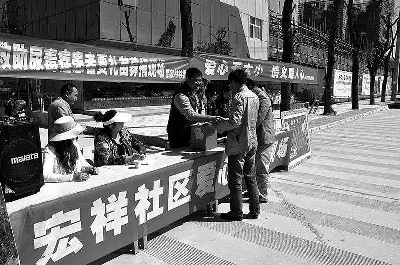 4月14日,山阳城关镇鬲家村村委会联合山阳爱心公益志愿者协会在宏祥小区门口和甘沟口开展“爱心无大小,情义暖人心”爱心救助公益活动。村干部、爱心村民、建筑工人以及爱心人士共计为尿毒症患者贾礼苗筹得善款32300元。(记者陈波摄)
