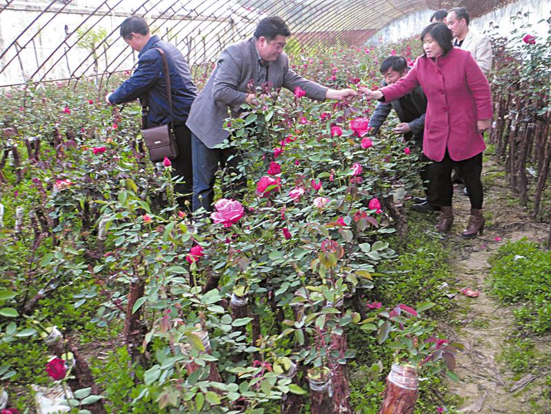 观赏完海棠,我们又来到富水镇王家庄村,在这里我们观赏了200多亩高杆月季。据了解,2012年底,李玉良租地280亩,投资1000多万元利用当地资源改良嫁接了几十个月季品种,栽植嫁接月季苗10万余株,与商南县德丰专业合作社联手打造了陕西首家以观赏植物为主的生产基地。基地建成至今囊括了月季种苗、树状月季、盆景月季等八大系列百余个月季品种,还培育有龙柱碧桃、望春玉兰等绿化观赏植物。正在盛开的月季花花香沁人心脾,有红色的、黄色的、白色的……像翩翩起舞的蝴蝶,像掩面含笑的少女,或绽放枝头,或含苞待放,或初绽花瓣,一枝一种姿态,一簇一种风情,极为赏心悦目。当人们看得如痴如醉的时候,李玉良介绍:“我经营的月季一年至少有10个月都开花。”这真应验了古人的一句雅诗:“花开花落无间断,春来春去不相关。”