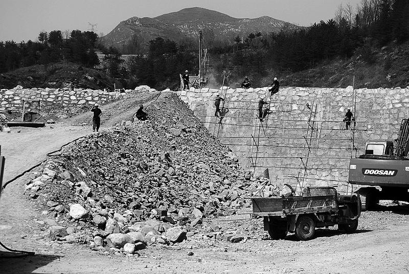 4月20日,记者在洛南县保安镇看到工人们正在加紧修建张坪水库大坝。投资1.67亿元的张坪水库建成后,将根本解决四十里梁塬10万亩烟田用水及县城和县城以西地区13.6万人生活用水。(记者余婷陈波摄)