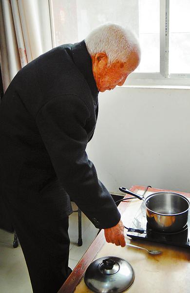郭子春老人虽然已经95岁高龄,但依然能下厨操作。 穿过商州区喧闹的东关菜市场,在一处民居里,我们见到了郭子春老人。一头白发,一身黑衣,整整齐齐,五世同堂,其乐融融。这位95岁高龄的老人是一位1949年参加中国人民解放军的老兵。近十年的军旅生涯,老人主要跟随部队在新疆的苦寒之地与国民党残余匪部作战,为扶风、兰州、新疆等地的全面解放作出了自己的贡献。