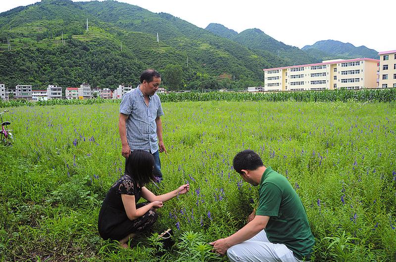 柞水县药办技术员近日深入杏坪镇金口村300亩黄芪基地指导药农进行病虫害防治。该基地位于杏坪镇金口村,总投资130万元,采用基地+合作社+药农的模式,通过土地流转的方式,由企业投资,药办提供技术指导,药农进行田间管理,最终受益,预计黄芩基地9月份可采收,将带动药农增收5000元。(卢丹 朱恢军 摄)