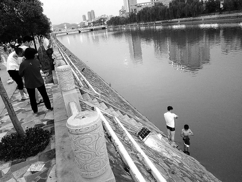 七月一日,雨后初晴,连日的降雨使河水上涨浑浊,但仍有市民带着孩子在丹江河里游泳。记者提醒市民,不要在丹江河中游泳,切莫图一时凉快忘了安全。(记者 杨鑫 摄)