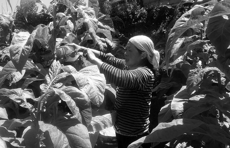 近年来,商州区板桥镇大力发展烤烟种植,农户在家门口就能实现增收致富。图为李河村村民张建忠的家人正在给烤烟防治蚜虫。仅烤烟一项,他家每年可增收3万元左右。(记者 谢非 王倩 摄)