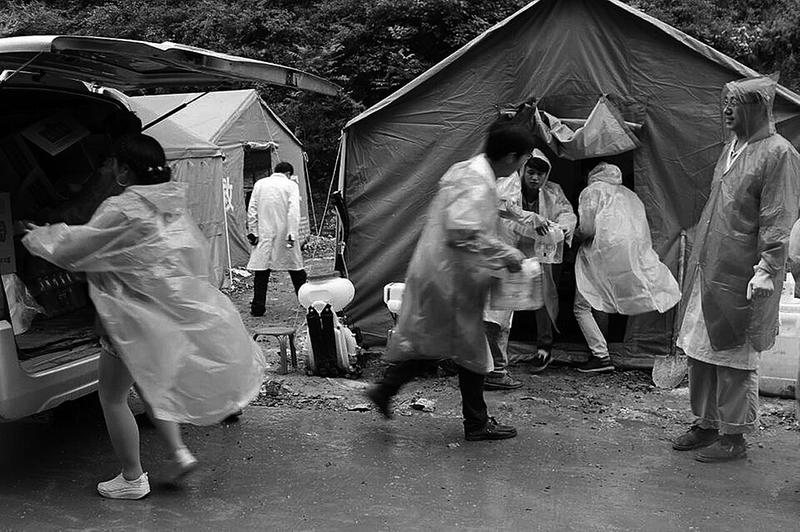 8月15日,记者在中村镇街道看到,一些遇难者家属和新闻媒体记者在挂有“8.·12”滑坡灾害免费义务服务点咨询,桌上还放有防暑药品和矿泉水,每一个服务点都有身穿白大褂的医生提供服务。在工作人员的帮助下,记者顺利找到中村镇政府。陪同的工作人员说,自12日凌晨发生特大滑坡灾害后,下湾村两委会就组织群众自发成立救灾义务服务点,在街道搭起凉棚,请来医生免费为被困群众家属和抢险救援人员义诊,为外来人员做导引。在通往救灾现场的6公里山路上,随处都有佩戴“红袖章”的村民,他们自发组建了义务巡逻队,随时为抢险救灾提供服务。