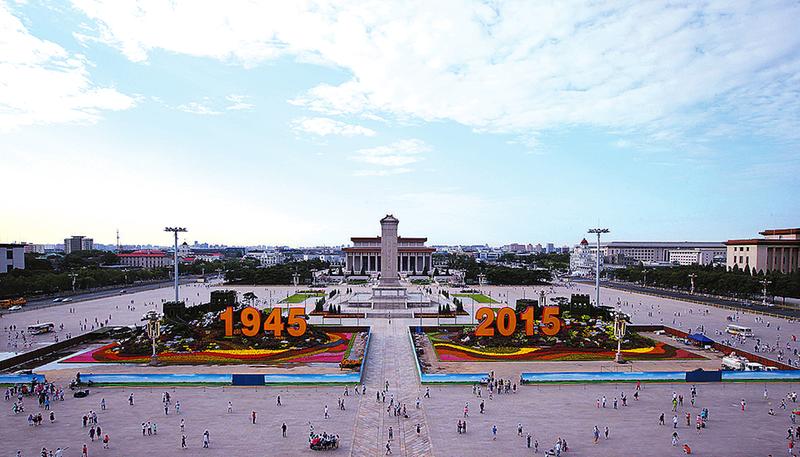8月26日零时,天安门广场纪念抗战胜利70周年花卉全部布置完毕。图为天安门广场长城主题花坛。(新华社记者 殷刚 摄)