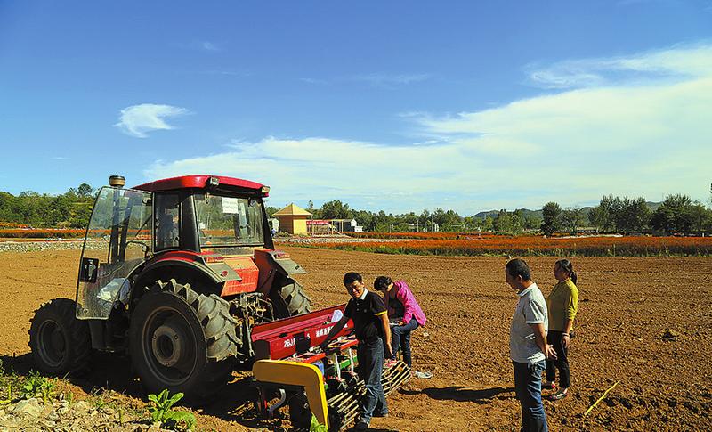 在寇村段,景观大道旁一个占地3000平方米的花海生态停车场正在紧张有序建设中。停车场附近,成片绽放着芳香的万寿菊。这些开放在秋日里的金色菊花,在阳光的照耀下,显得更加璀璨。周边的地块已深耕平整,工人正在利用“油菜施肥精密播种机”播撒油菜籽。不久,这里将呈现出黄灿灿的油菜花。