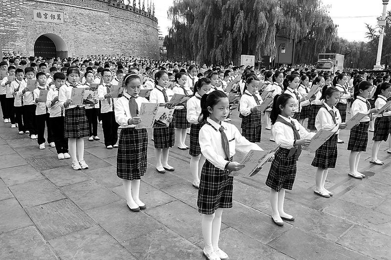 九月二十八日,参加祭孔大典的小学生在诵读《论语》。当日是伟大的思想家、教育家、哲学家、儒家学派创始人孔子诞辰二千五百六十六周年纪念日。孔子故里山东曲阜在孔庙举行祭孔大典,来自海内外的学者和孔子后裔近千人参加祭祀活动。(新华社记者 孟涛 摄)