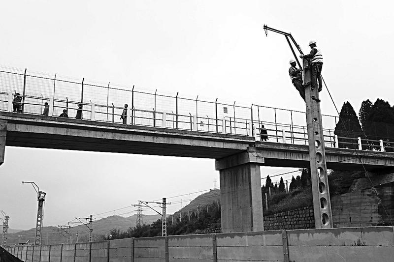 10月3日,中铁一局电务公司工程人员在宁西铁路丹凤段凤冠山下安装供电设施。据悉,宁西铁路增建二线工程预计今年年底建成开通。承建宁西二线商洛段电务配套工程的技术人员,国庆长假期间坚守施工岗位,加班安装供电设施。(记者 赵有良 摄)