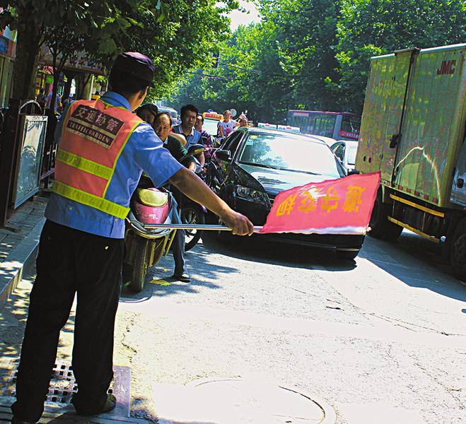 身为协勤,陈义军每天的主要工作就是劝阻闯红灯的行人和摩托车驾驶者。