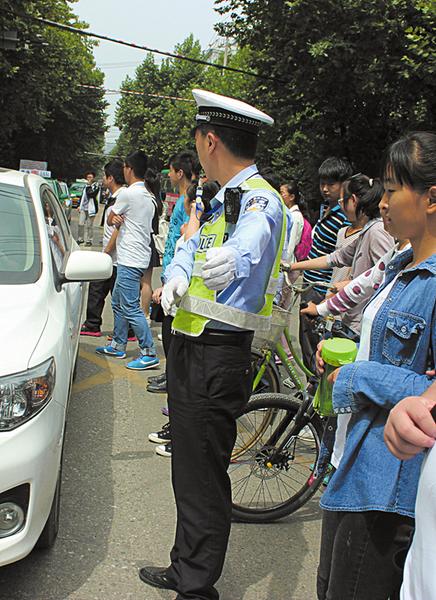 商中学生放学,原本宽阔的北新街立马变得拥挤不堪,在交警管文龙的疏导指挥下,行人和车辆有序通行。