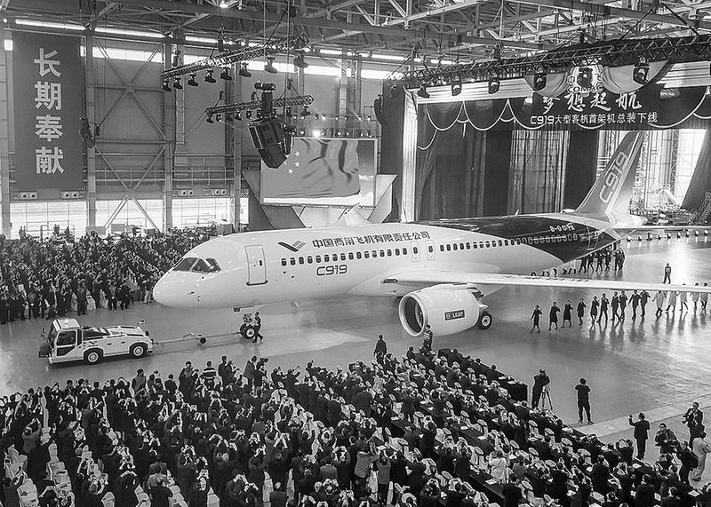 11月2日,我国自主研制的C919大型客机首架机,在中国商飞公司新建成的总装制造中心浦东基地厂房内正式下线。这不仅标志着C919首架机的机体大部段对接和机载系统安装工作正式完成,已经达到可进行地面试验的状态,更标志着C919大型客机项目工程发展阶段研制取得了阶段性成果,为下一步首飞奠定了坚实基础。(新华社记者 裴鑫 摄)