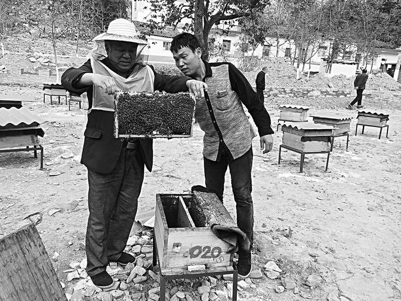 山阳县高坝店镇双寨村按照“总工会补大头,群众凑一点,镇政府兜底”的办法,找准项目发展养蜂产业,并筹措近20万元为该村养蜂户购买蜂种、配送蜂具,提供技能培训,为村民脱贫致富出谋划策。图为包村干部近日与群众交流养蜂经验,现场提供技术指导。(记者 李敏 摄)