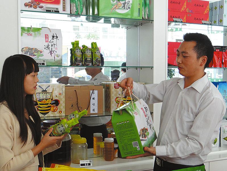 徐涛联想起以前每次过完年去广东的时候,妈妈总会给他带自己家里的腊肉干,每每都会被一抢而空,还有很多同事央求再给多带一些过来。他觉得农特产品销售是一个可以带动大家一起致富的好路子。其实在2008年他便开了网店,只是因为工作太忙而没有好好经营过。说干就干,徐涛首先去上海考察了农特产品店成熟的销售模式,然后调动自己的人脉资源联系货源。2015年,拥有现代化的装修风格和现代化的管理理念的农特产品店在商南县城开张,同时徐涛的网店和微店也同时销售,生意兴隆。在徐涛的店里,记者注意到,有陕北的五谷杂粮小米,内蒙的牛肉干,汉中的黑米,还有一家日资企业生产的香菇脆等零食产品。但摆在显眼位置的,是商洛当地的农特产:葛根粉、神仙叶凉粉和土鸡蛋。“在金丝峡有一位老人,家里养了200多只鸡,土鸡蛋质量非常好,但是没人知道没人买,可把老人愁坏了。我跟他说,有多少我都给他代销。因为好东西卖不出去,明年他就再也不会养了,客户也很难吃到原生态的好产品。”