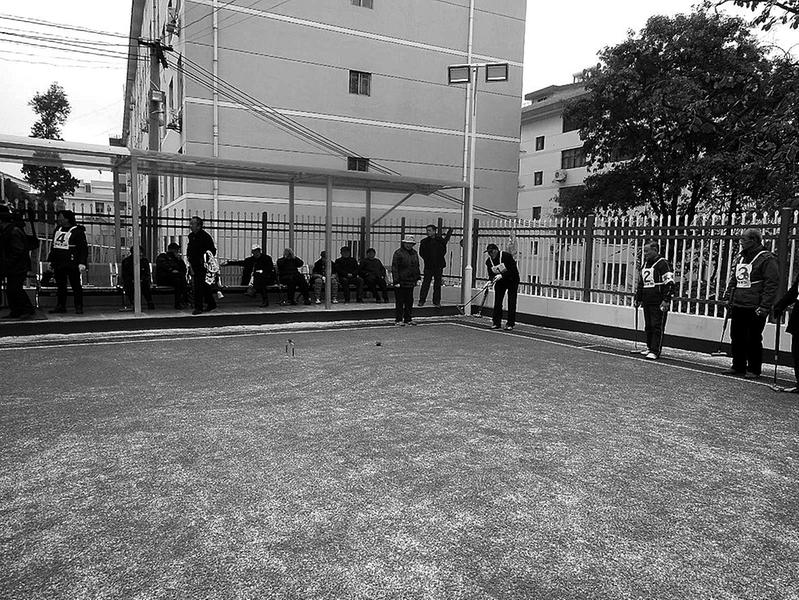 日前,我市首个标准化人工草坪门球场建成并投入使用,在这里打球的老人们掩饰不住兴奋的心情:今后可以享用舒适的人工草地门球场了。该门球场坐落在市委家属区内,面积达三百多平方米,投资十七万元。(彭书强 摄)