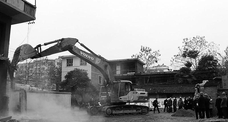 11月27日,黄沙桥棚改管理处联合相关部门,在市农机局院内启动黄沙桥片区棚户区改造项目拆迁工作。图为工作人员正在拆除市农机局办公楼。(记者 余婷 摄)