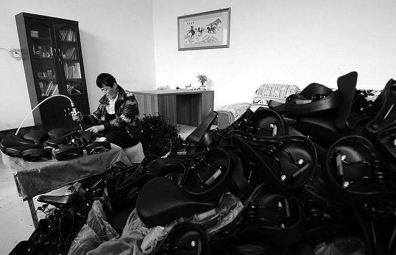 12月13日,河北省广宗县路屯村村民侯玉敏在自家客厅组装自行车鞍座。位于河北省南部的邢台市广宗县是国家扶贫开发重点县。近年来,广宗县依托当地快速兴起的自行车、童车制造业,加大与其相关的家庭手工业扶贫力度,形成了自行车鞍座、钳形闸、刹车皮、闸把等30多个手工业扶贫片区,解决了农村劳动力特别是农村妇女的就业问题,加快了当地群众的脱贫致富步伐。(新华社发 陈雷 摄)