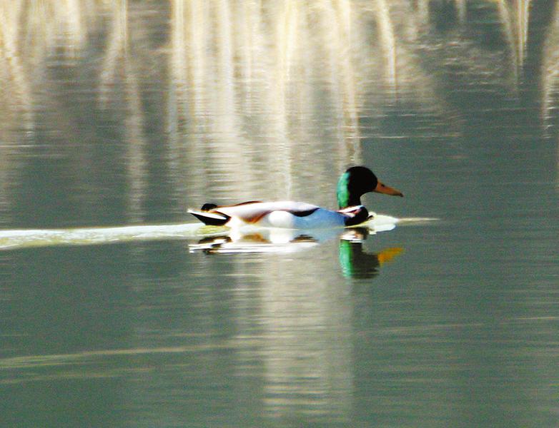 初冬的仙娥湖,阳光明媚,波光粼粼。远处的廋山,远处山上的树,湖中泛着白光的树、芦苇、甚至农家还未顾上收拾的包谷秆,都浸在了水里,映在水里。仙娥湖,一幅极具冬韵的水墨画。此时恰到好处的有几只或者一群野水鸭缓缓游过,拉起一道道漂亮的光影,仙娥湖活了过来。