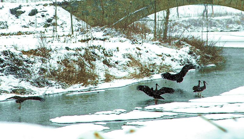 笔者去年冬季在南秦河畔拍摄到一群黑鹳在雪中嬉戏。