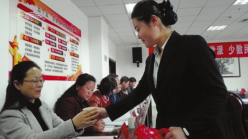 一杯暖茶、一弯微笑,贴心周到的大会服务,给两会增添了温馨。(记者 马泽平 摄)