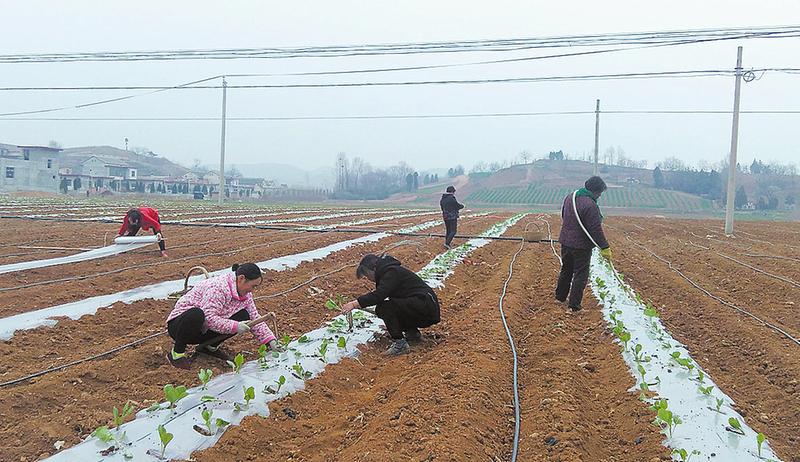 三月二十五日,洛南县景村镇齐坡村村民抢抓农时栽植地膜甘蓝。近年来,景村镇把蔬菜种植业做为农民增收的一个重要产业来抓,积极推广甘蓝与青椒套种,提高种植效益。今年全镇共发展甘蓝一千一百余亩,青椒八百余亩,两个产业年产值达四百余万元。(程刚 摄)