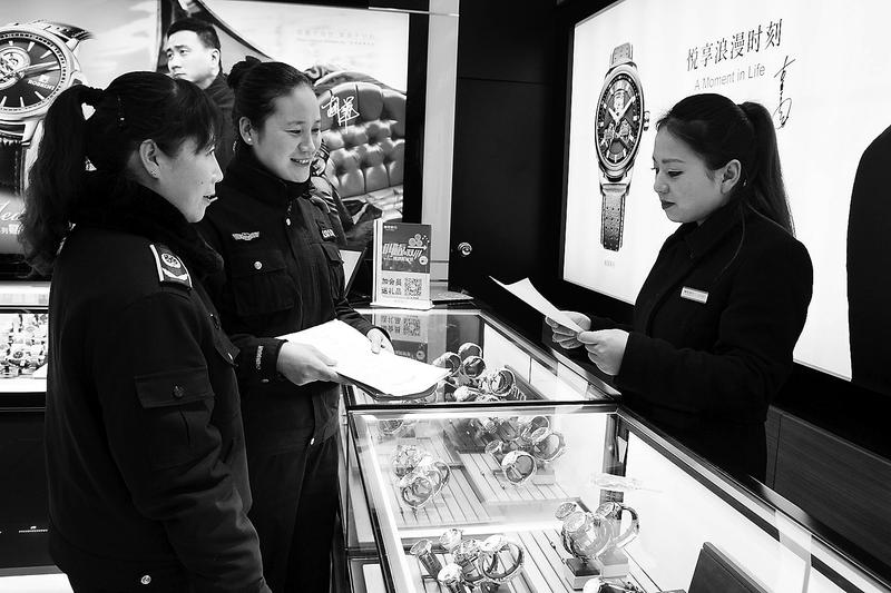 为了营造整治市容环境的浓厚氛围,督促整改问题落实到位,市城管监察支队面向沿街经营业户、流动商贩、建筑工地等服务对象发放告知书,提醒告知商户业主自觉遵守市容管理法纪法规,整改存在的问题。图为城管人员送法进店宣传。(田亚鹏 余婷 摄)