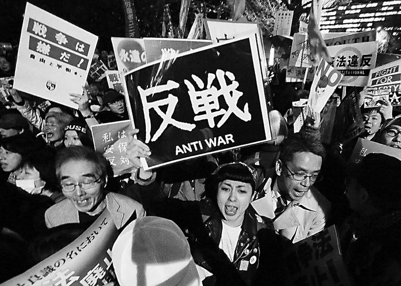 当日,安倍政权强推的新安保法正式实施,标志着日本战后长期坚持的“专守防卫”政策被扫入历史故纸堆,日本一贯标榜的“和平国家”招牌也被摘除。当晚,约3.7万名日本民众在国会前集会,强烈抗议安保法实施并要求立即废除该法。(新华社/法新)
