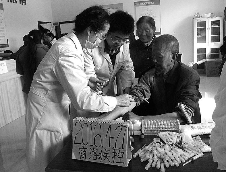 四月二十七日,市疾控中心抽调三十多名专业技术人员来到包扶村——洛南县四皓街办杨底村,组织开展扶贫助医健康体检活动,针对体检对象既往病史,进行详细了解,力求全面掌握贫困对象健康状况,并将精准扶贫对象的健康保障纳入系统管理,建立贫困群众健康档案,随时跟踪检查。(王尚锋 白晶 摄)